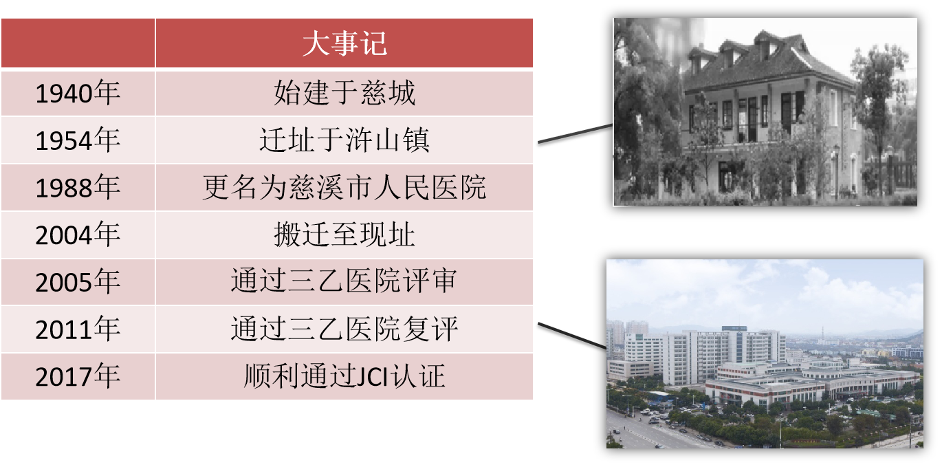 慈溪市人民医院始建于1940年,是一所集医疗、教学、科研、预防和康复为一体的三级乙等综合医院,也是温州医科大学非直管附属医院。医院学科齐全,现有员工1834人,开放床位数1035张,47个临床及辅助科室。医院占地面积107818㎡,总体建筑面积154809㎡,为病人提供了优美、舒适的就医环境,拥有64排螺旋CT、核磁共振、飞利浦DSA、西门子钼靶机等先进医疗设备阵容,确保了诊疗品质。
