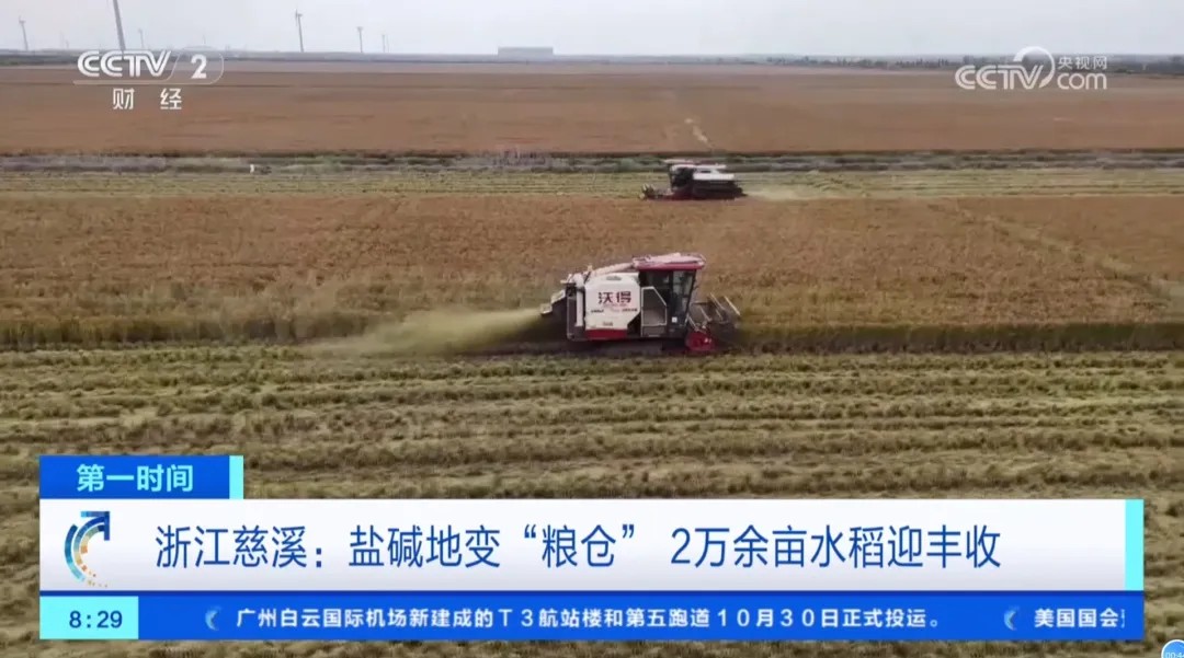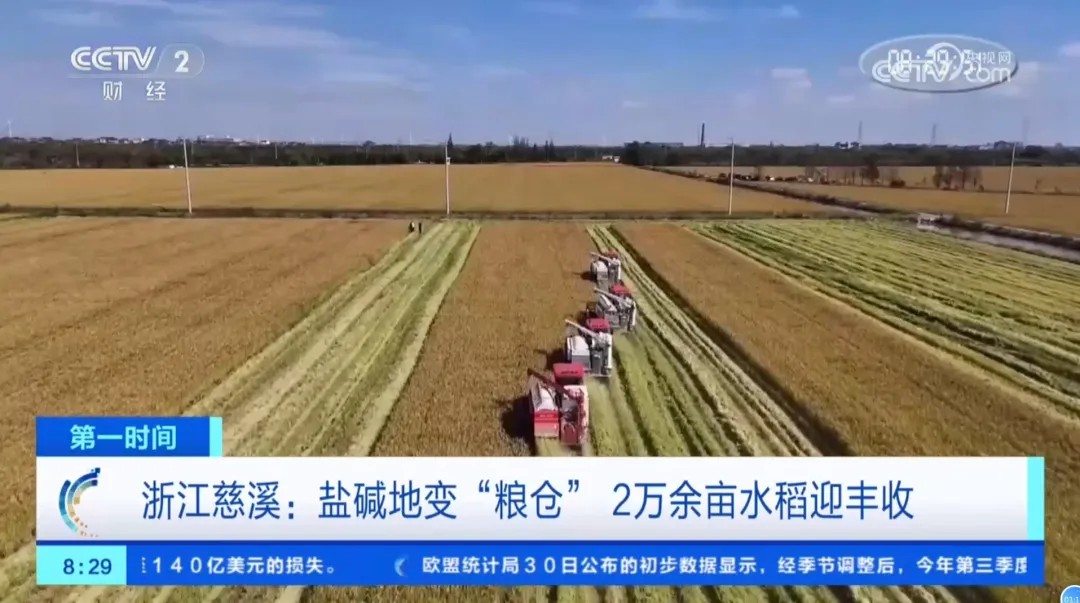 昨天,央视《第一时间》栏目播出《浙江慈溪:盐碱地变“粮仓” 2万余亩水稻迎丰收》,报道了近年来,慈溪市不断通过土壤改良,实现盐碱地水稻连年丰产。近日,2万多亩盐碱地种植的水稻陆续成熟,进入收获期。